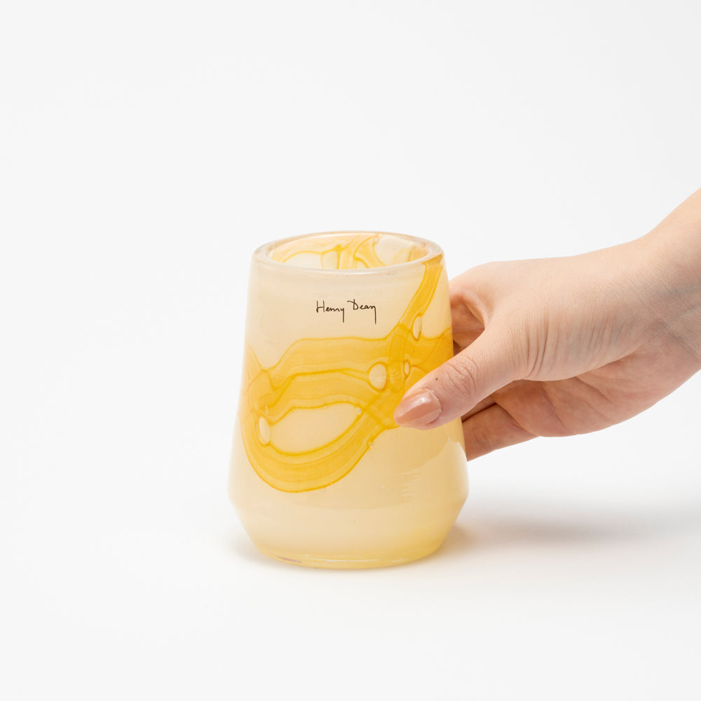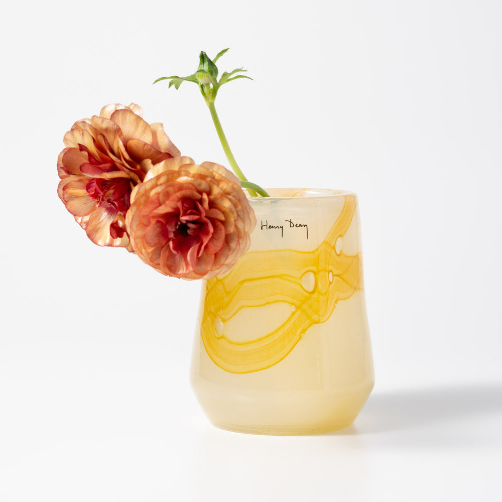 「Clemence」のフォルムを、よりコンパクトなサイズへと再構成した「Clementine」。活け口に向かって緩やかにすぼむデザインは、少量の花やグリーンでも自然にまとまります。奥行き 7 x 高さ 11 (cm)