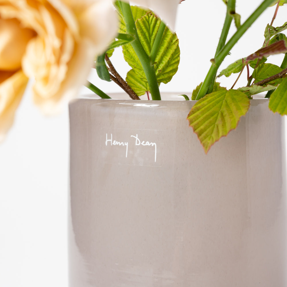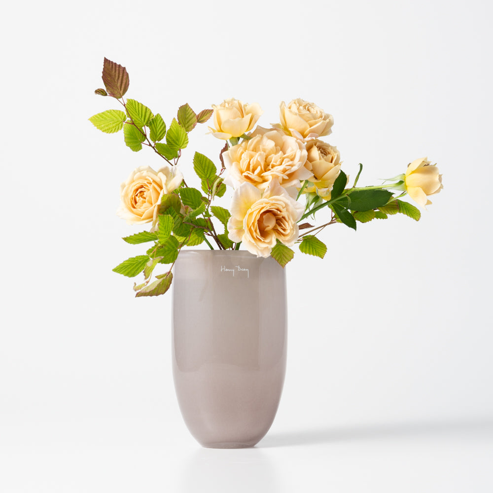生け口は楕円形。底に向かってすぼんだフォルムがかろやかな印象を作り上げています。水を入れるとさらに安定感が増すので、花をたっぷりと活けられます。ボリュームのある花束や少し背の高い花を入れても。奥行き 6.5 x 幅 11 x 高さ 16 (cm)